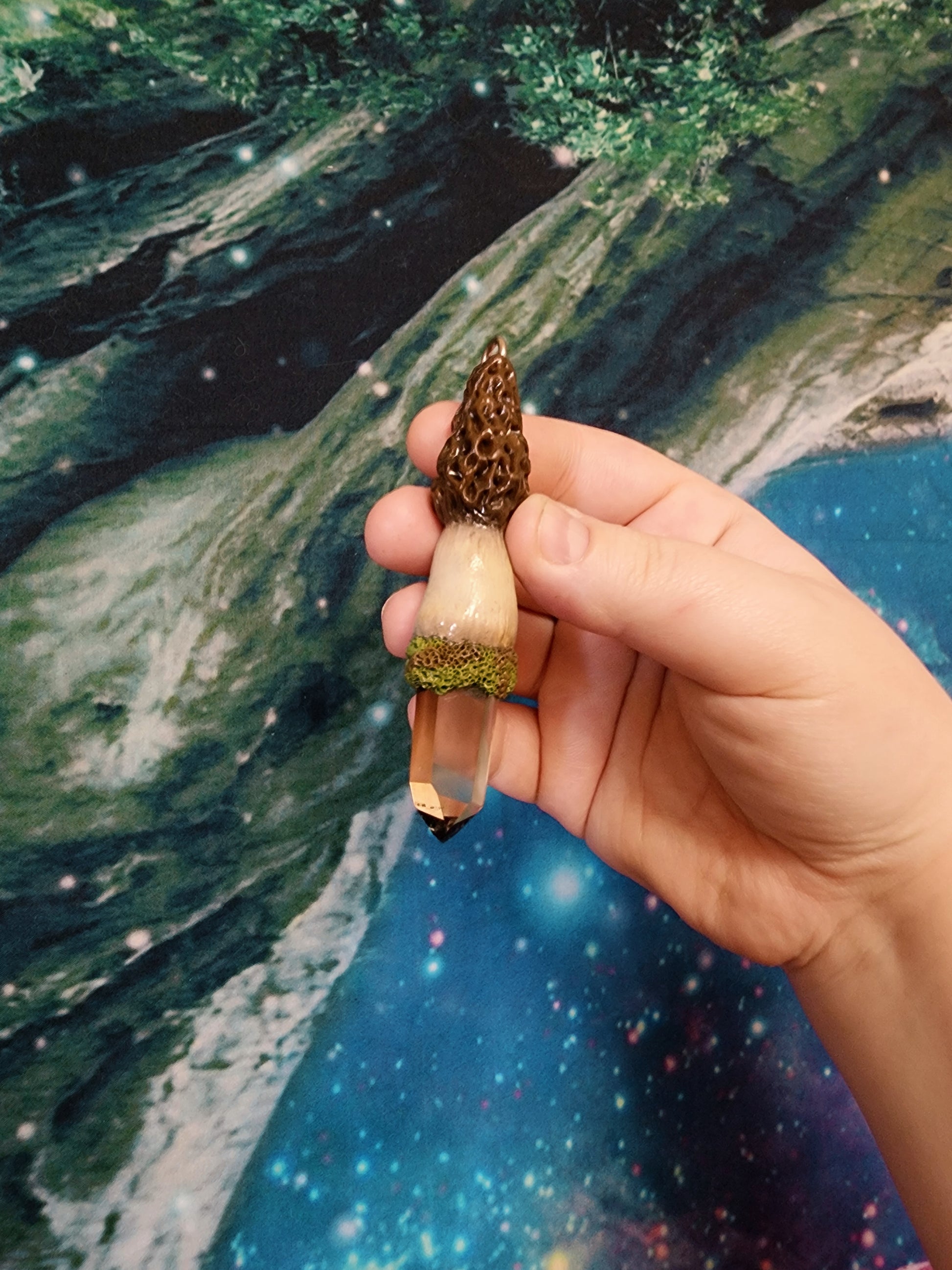 A big freshly foraged morel mushroom covered in morning dew with a pristine chonk of smokey quartz.