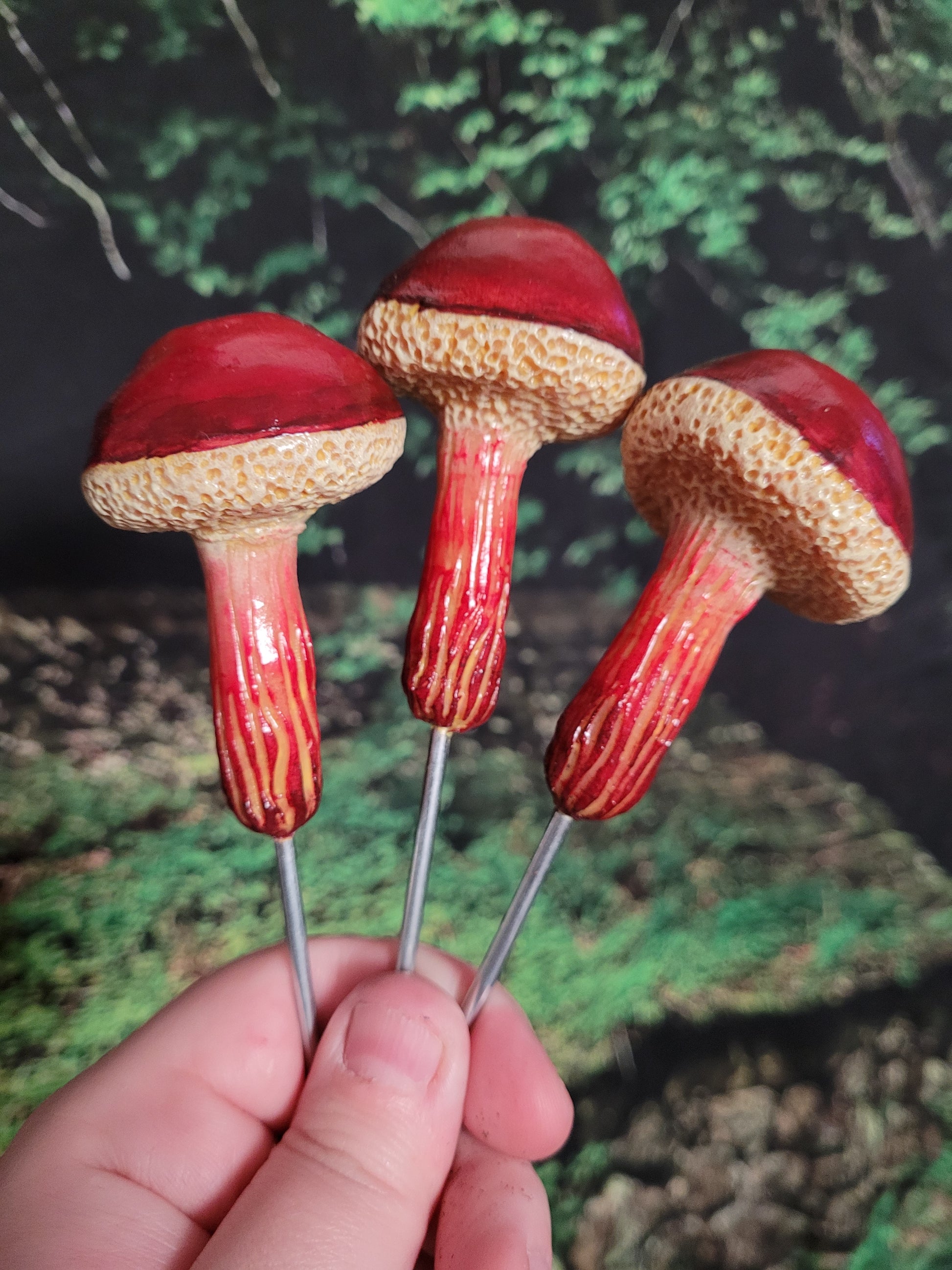 Add a touch of magic to your plant babies with this whimsical hand painted and sculpted bolete mushroom plant stake. Boletes are so cool because they have a delicious spongey texture underneath instead of gills. They always remind me of natures fuzzy peach candy.