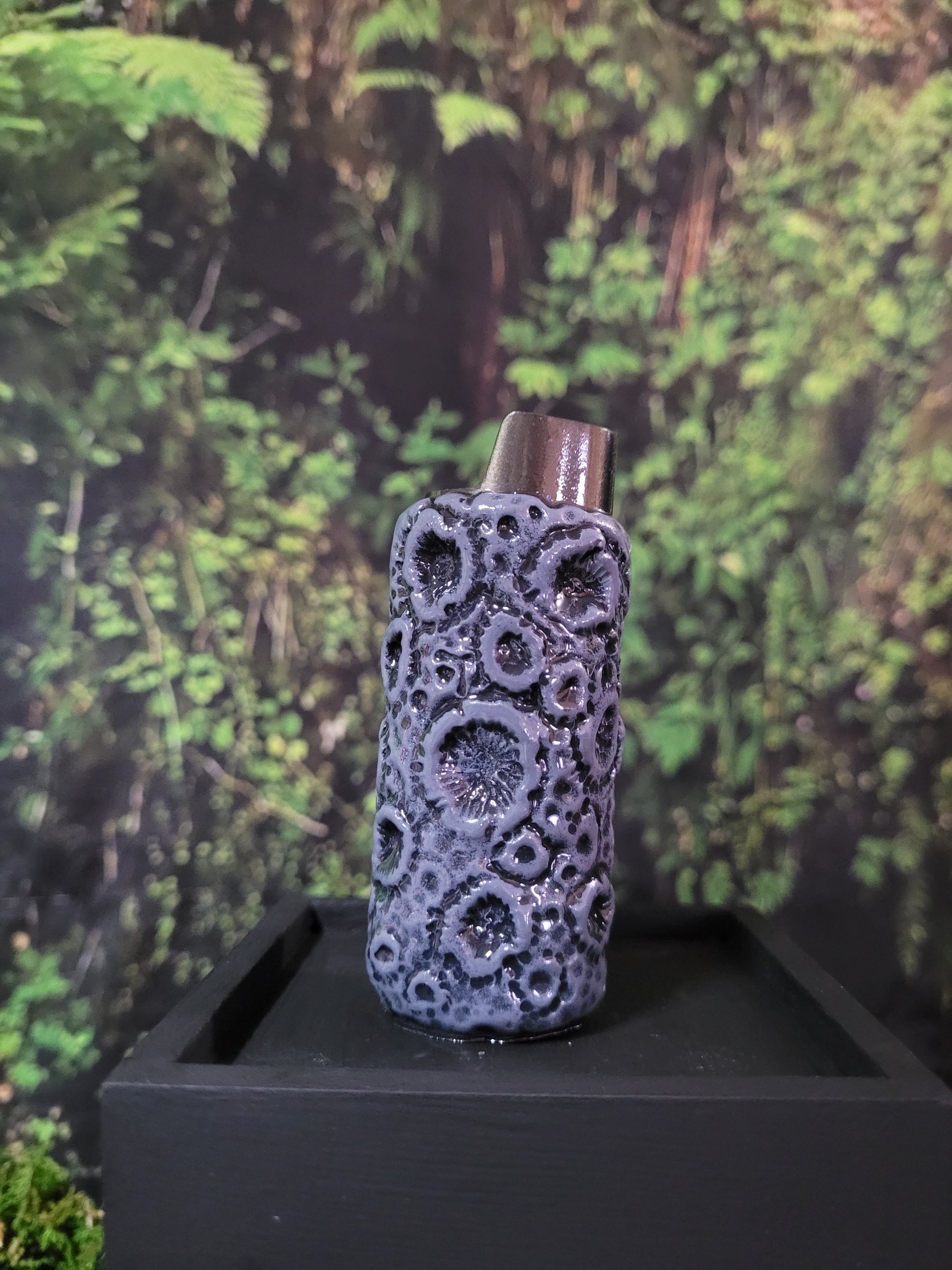 This is a metal lighter case covered in hand sculpted polymer clay and encased in epoxy resin to ensure waterproofing and chip proofing.