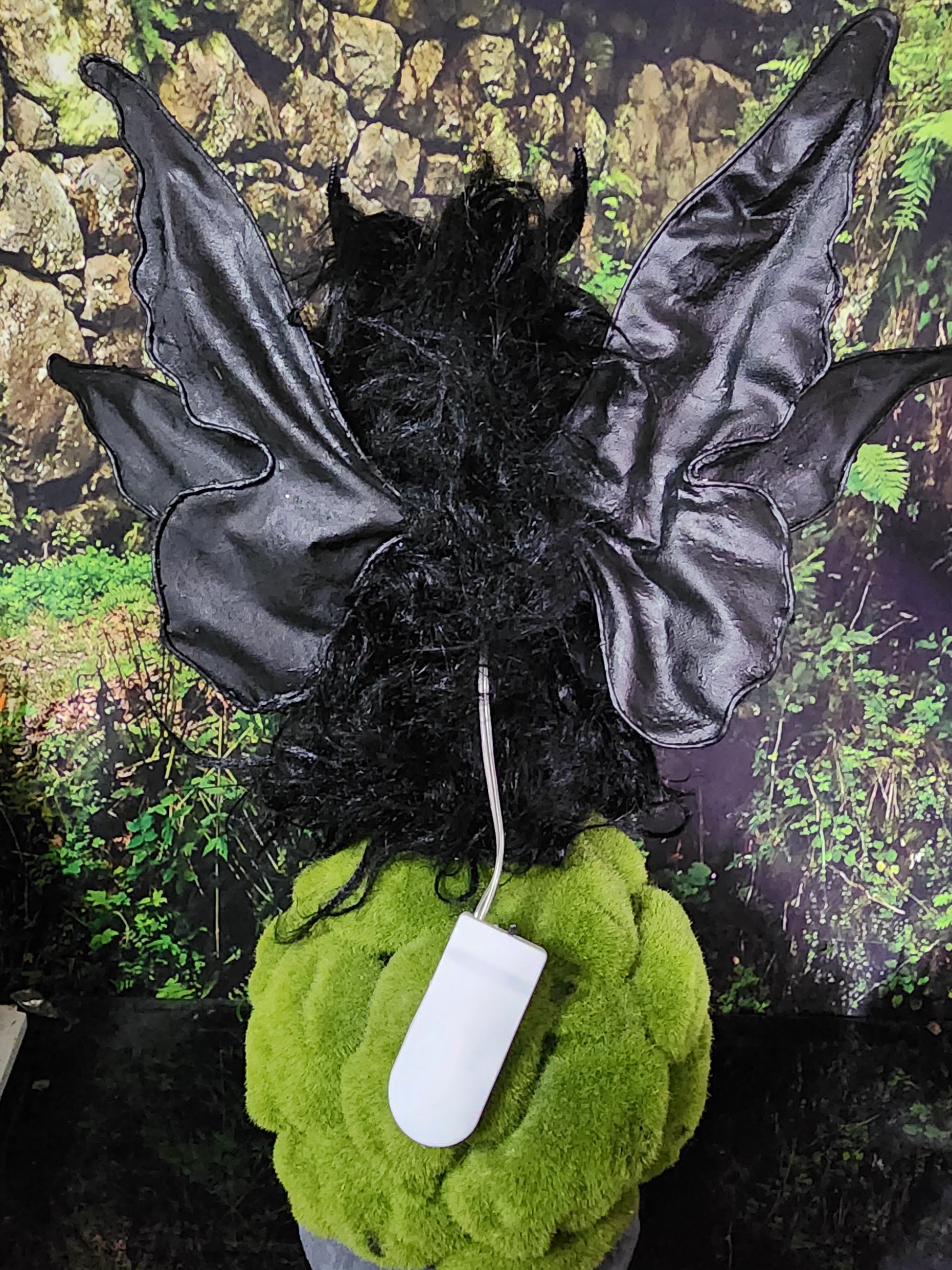 I thrift flipped a vintage fairy doll I found at a creepy market that I saw lots of hot moth goth potential in. She's 11 inches tall and has luscious eyelashes and red glowing eyes. The watch battery operated switch is hiding behind her. I believe she is actually Mothman's cousin but I stopped asking because she let out this gut wrenching shreak that made me feel faint.