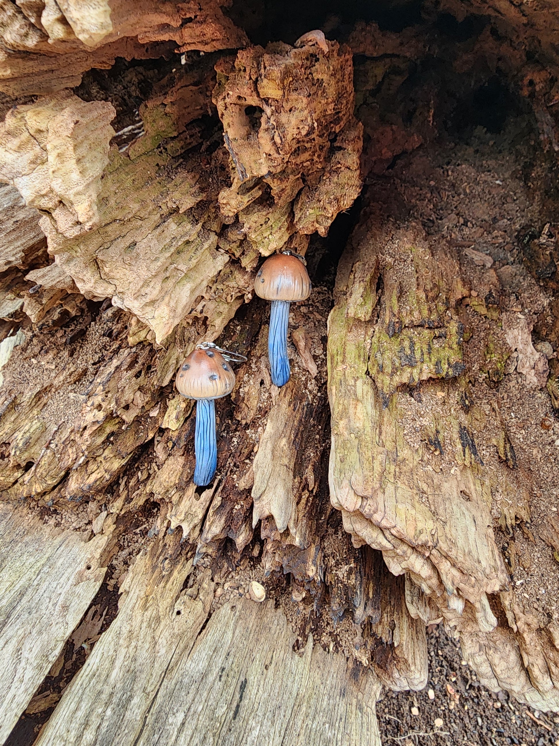 Hand sculpted and painted magical mushies with stainless steel lever back attachments. 5cm length.