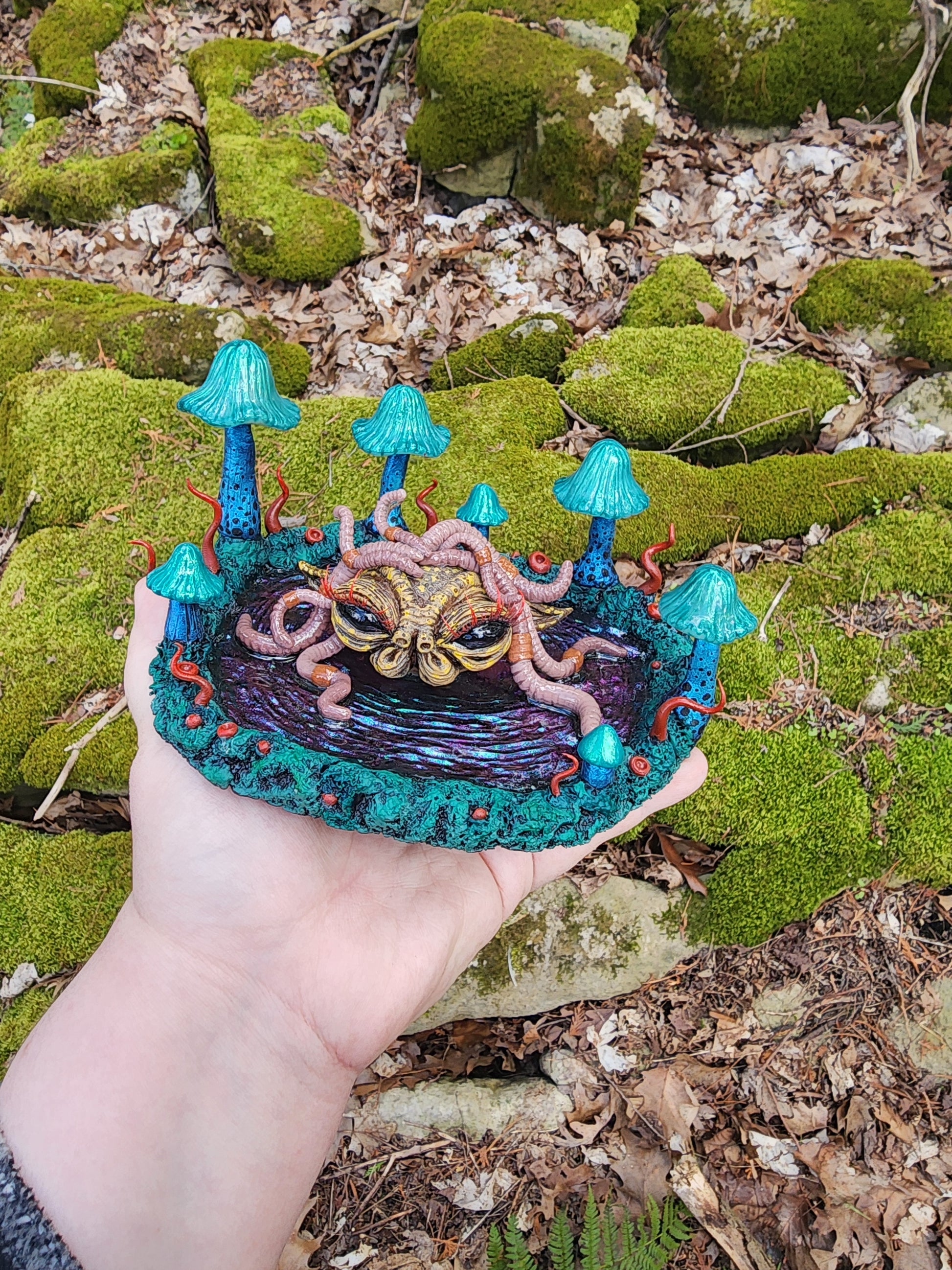 With hair woven from glistening strands of worms, she lured unsuspecting prey to the edge of her enchanted pond. Her black eyes glinted in the moonlight, and her skin bore the markings of a creature both amphibian and ethereal. Mudpuppy gills adorned her lashes, fluttering gently with each breath.