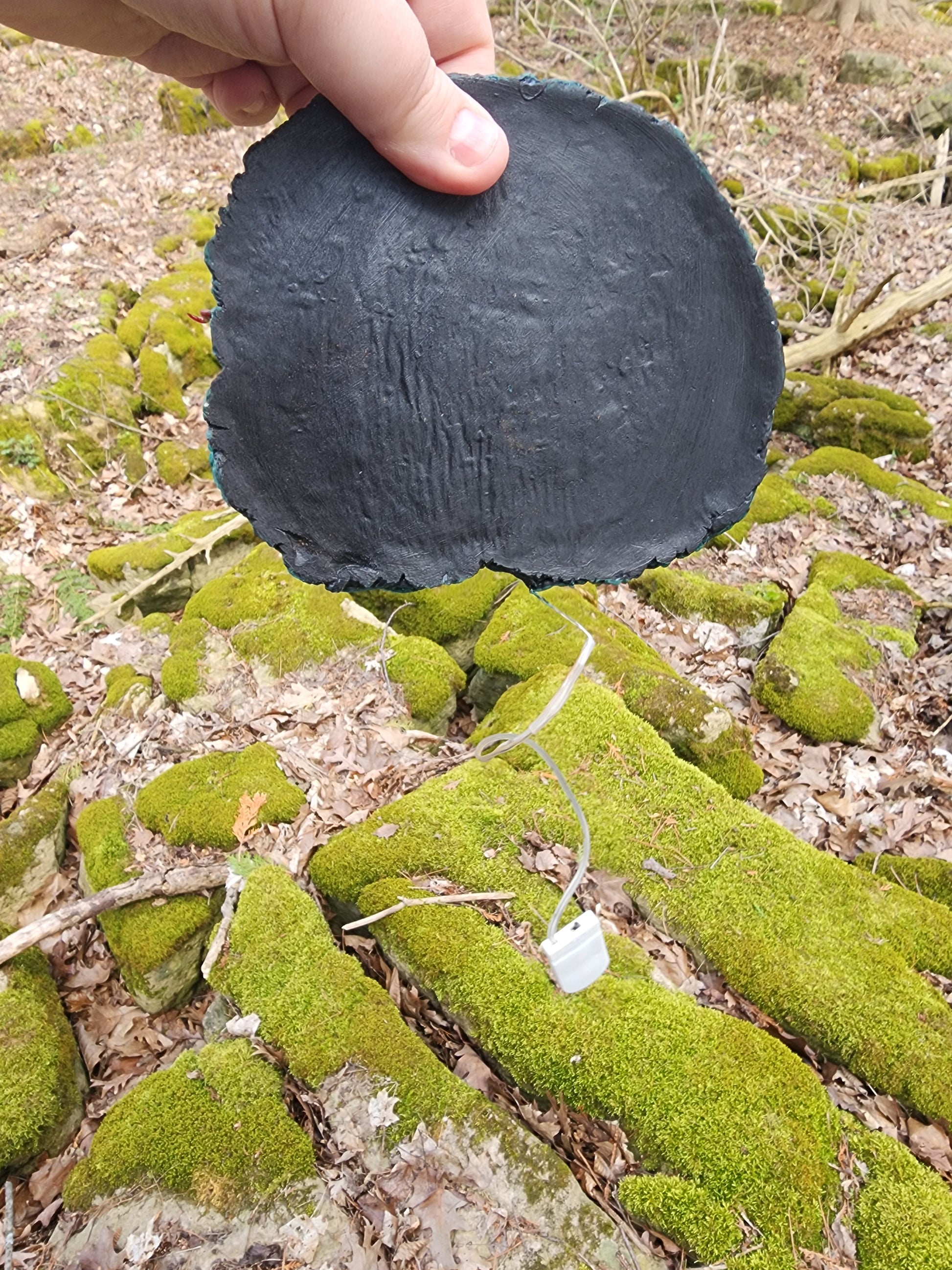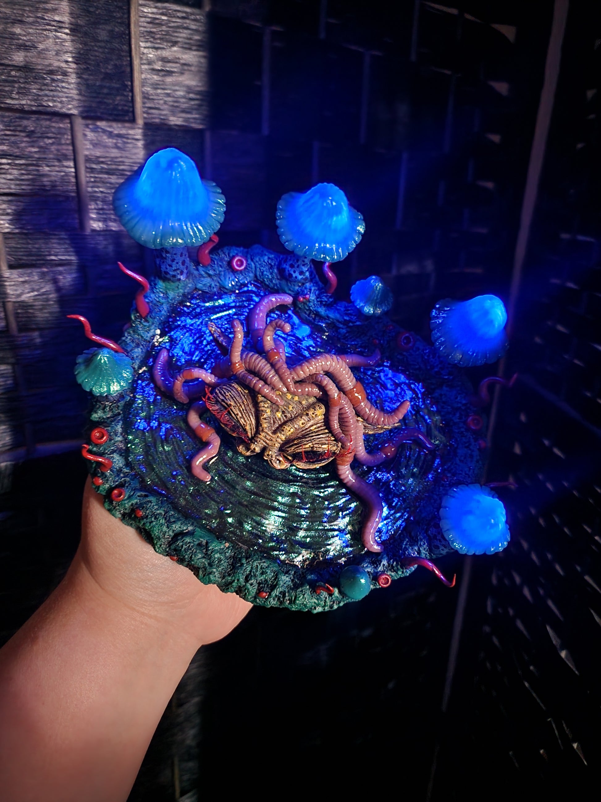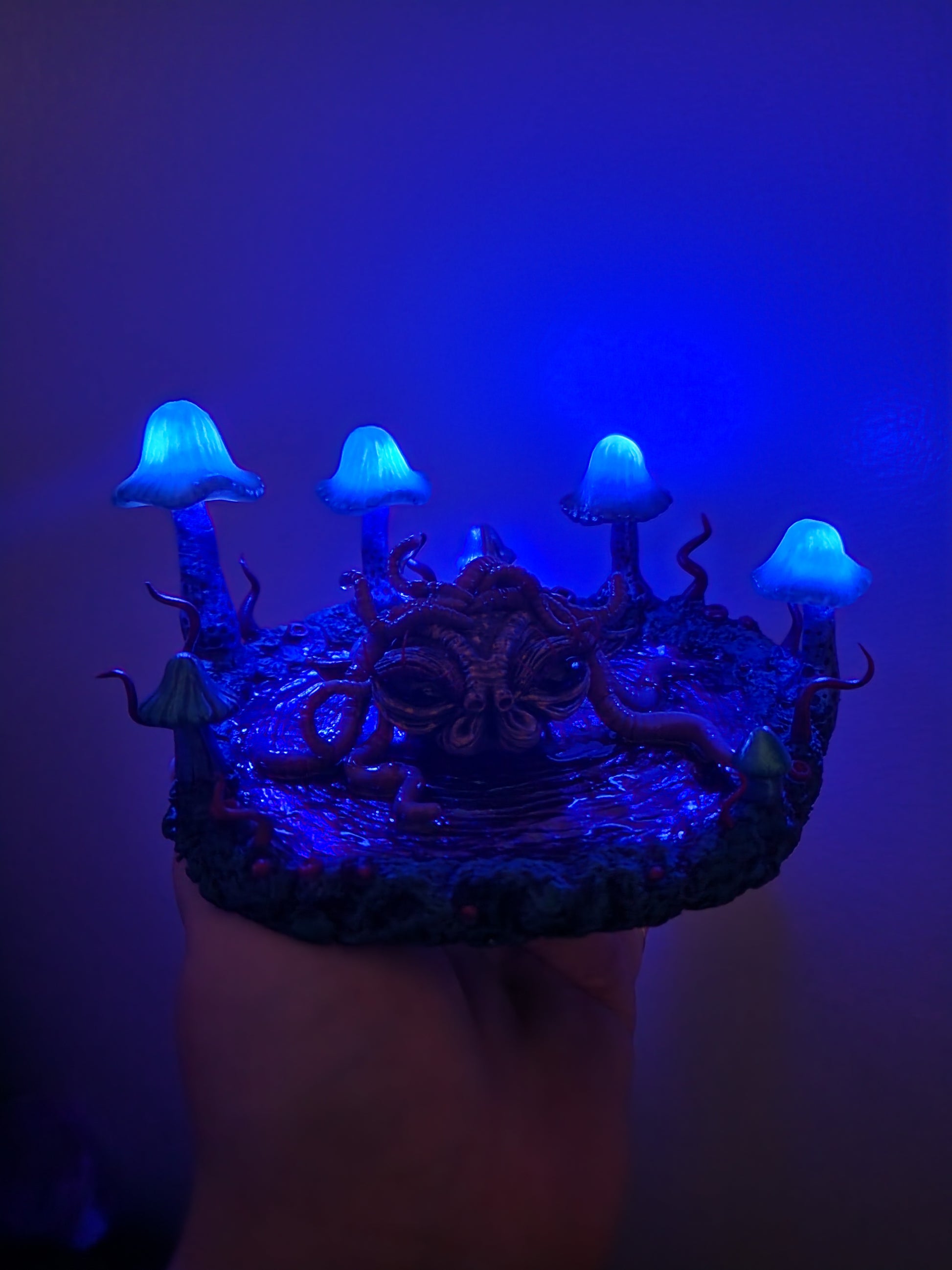 Hand sculpted fairy piece not intended to be a toy. Mushroom lights have a watch battery operated switch with about 5 inches of wire attached.