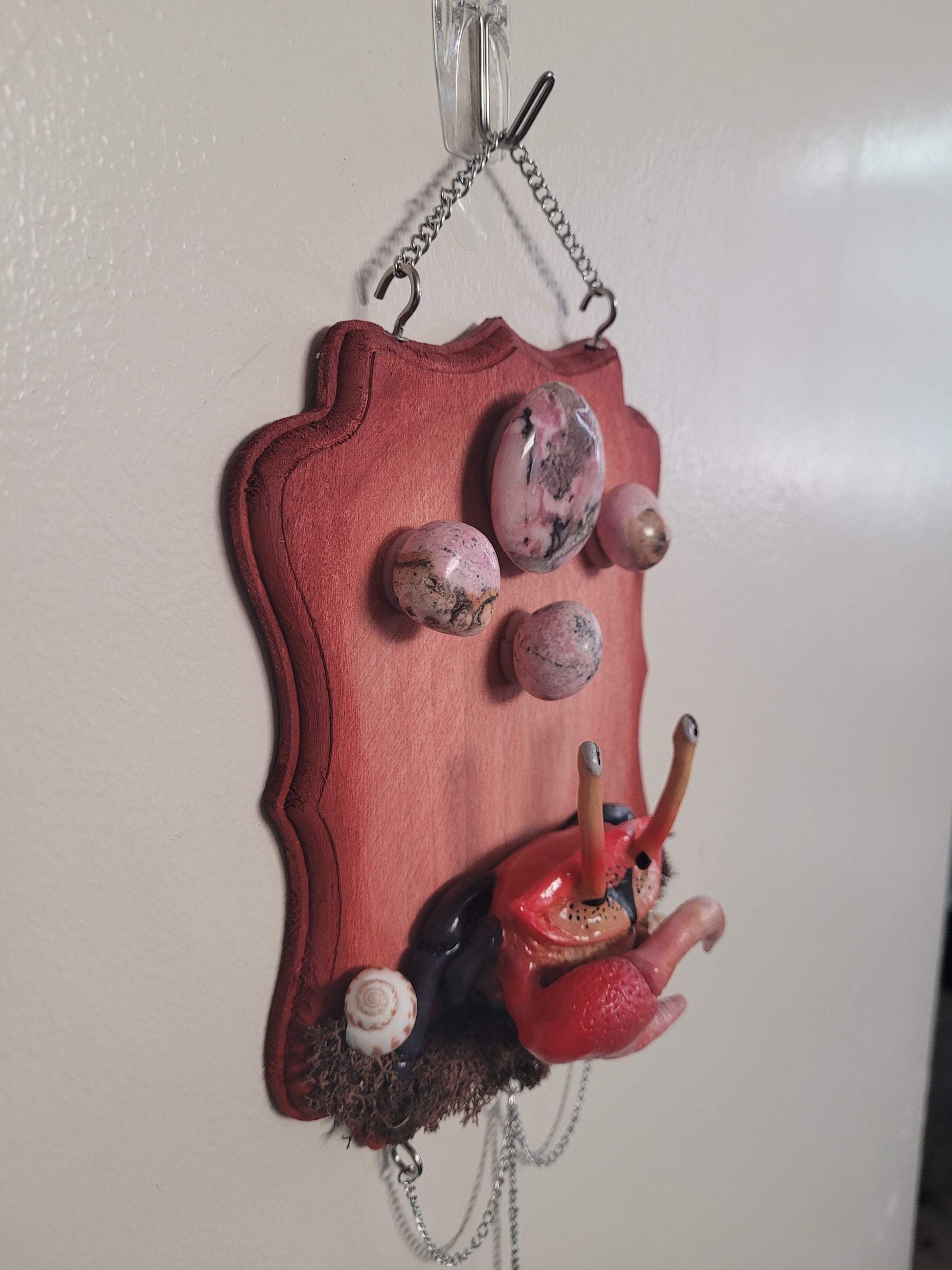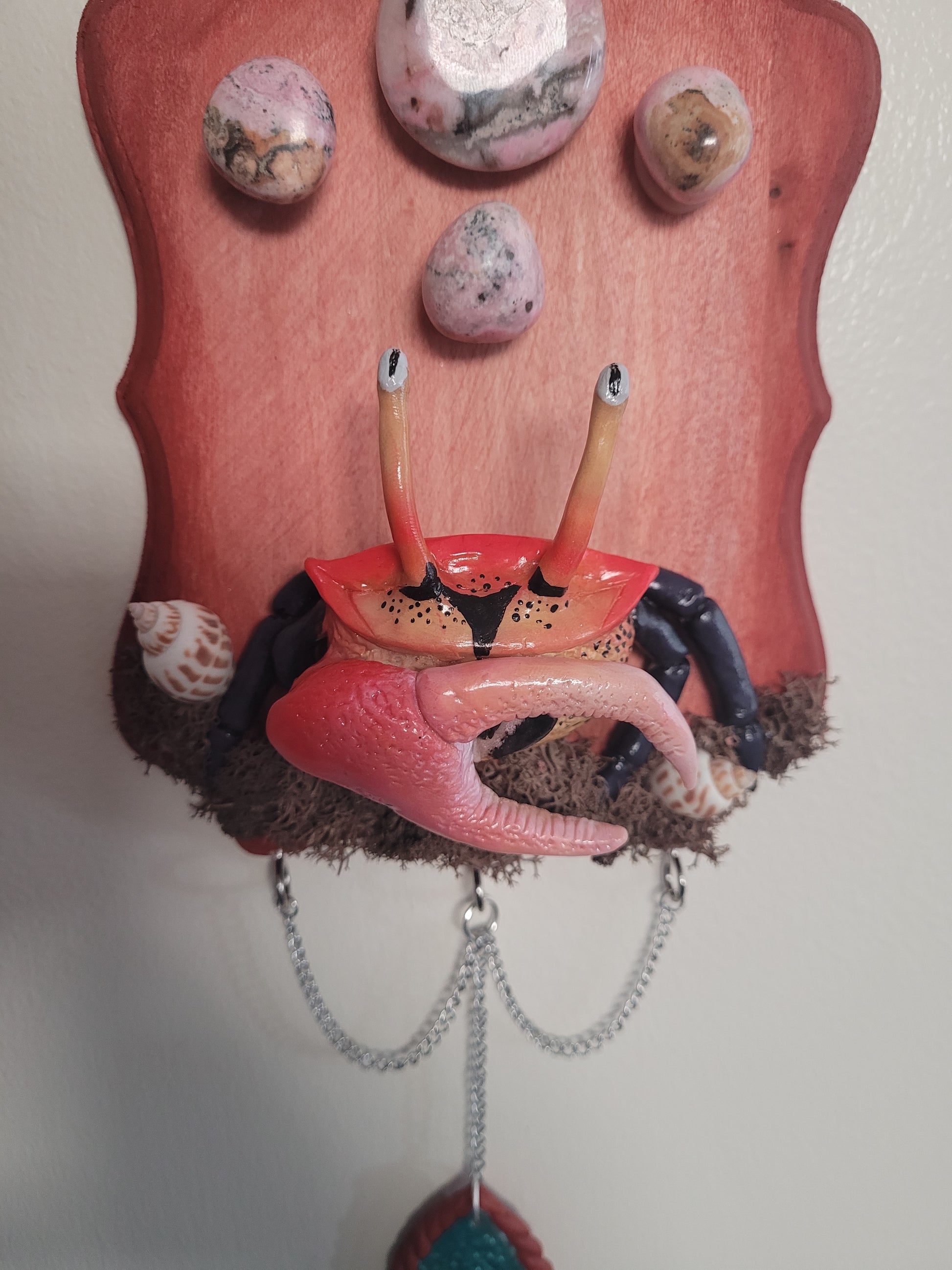 Happy Cancer season! I have created this Rhodonite wall hanging to enhance your space with calming, loving beach vibes. The fiddler crab is so perfect because it looks almost too cute in a way to hurt anyone but that one enormous claw will in fact end you at any instance, just like yall!