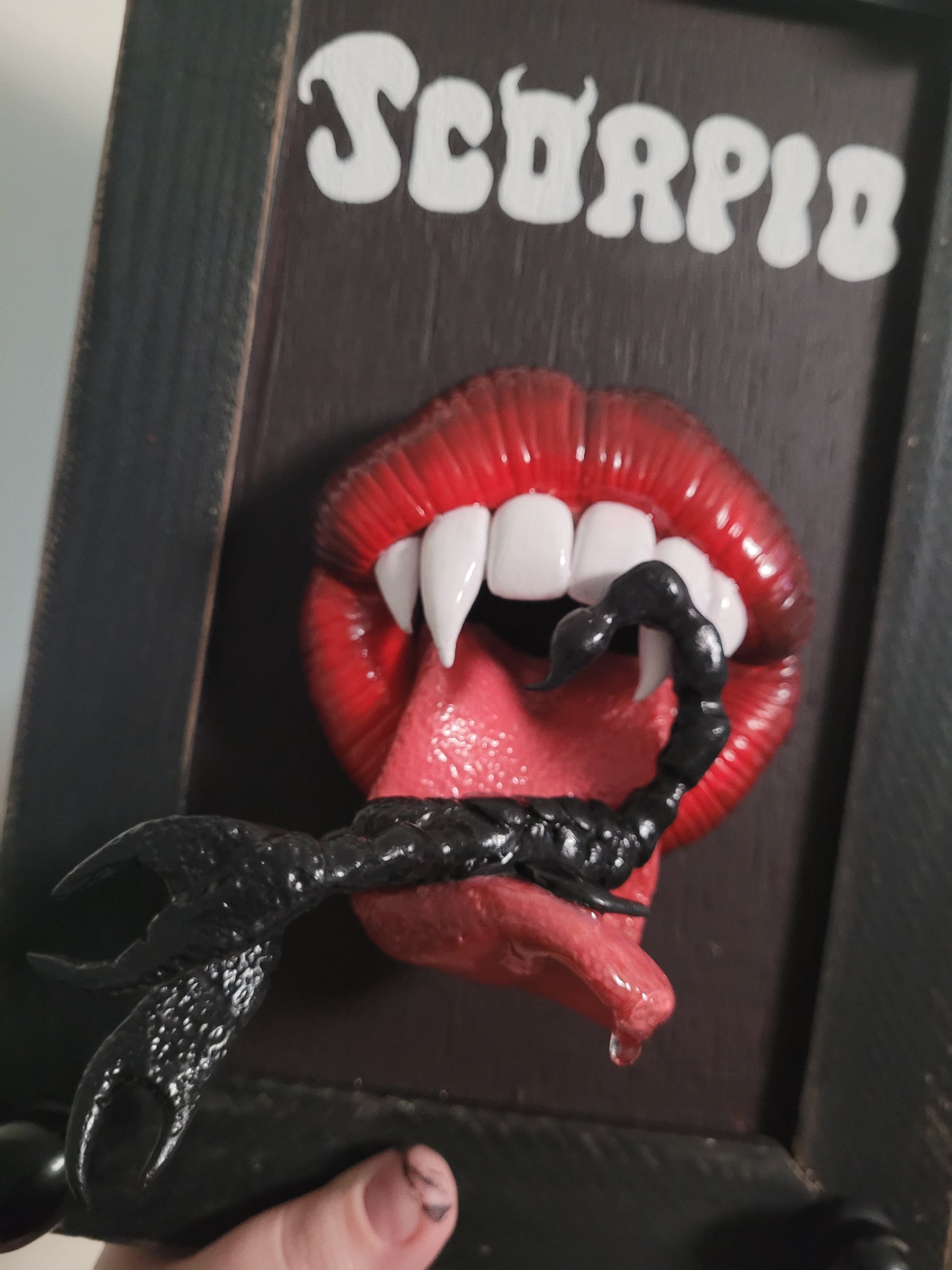 Happy Scorpio season! I was feeling super inspired this month to make the hanging a little different than the other signs. I was able to find a cool grungy wall plaque at the thrift store to use as the wall mount. It adds some freaky spice to this piece along with the succulent drooling tongue. Scorpios give me a haunted strip club, Jennifers body kind of energy so I chose the mouth to be the main visual representation of you. The scorpion is on the tongue because of your venomous communication while hurt or defending people. The lips are big, juicy and sexy like your constantly horny attitude.