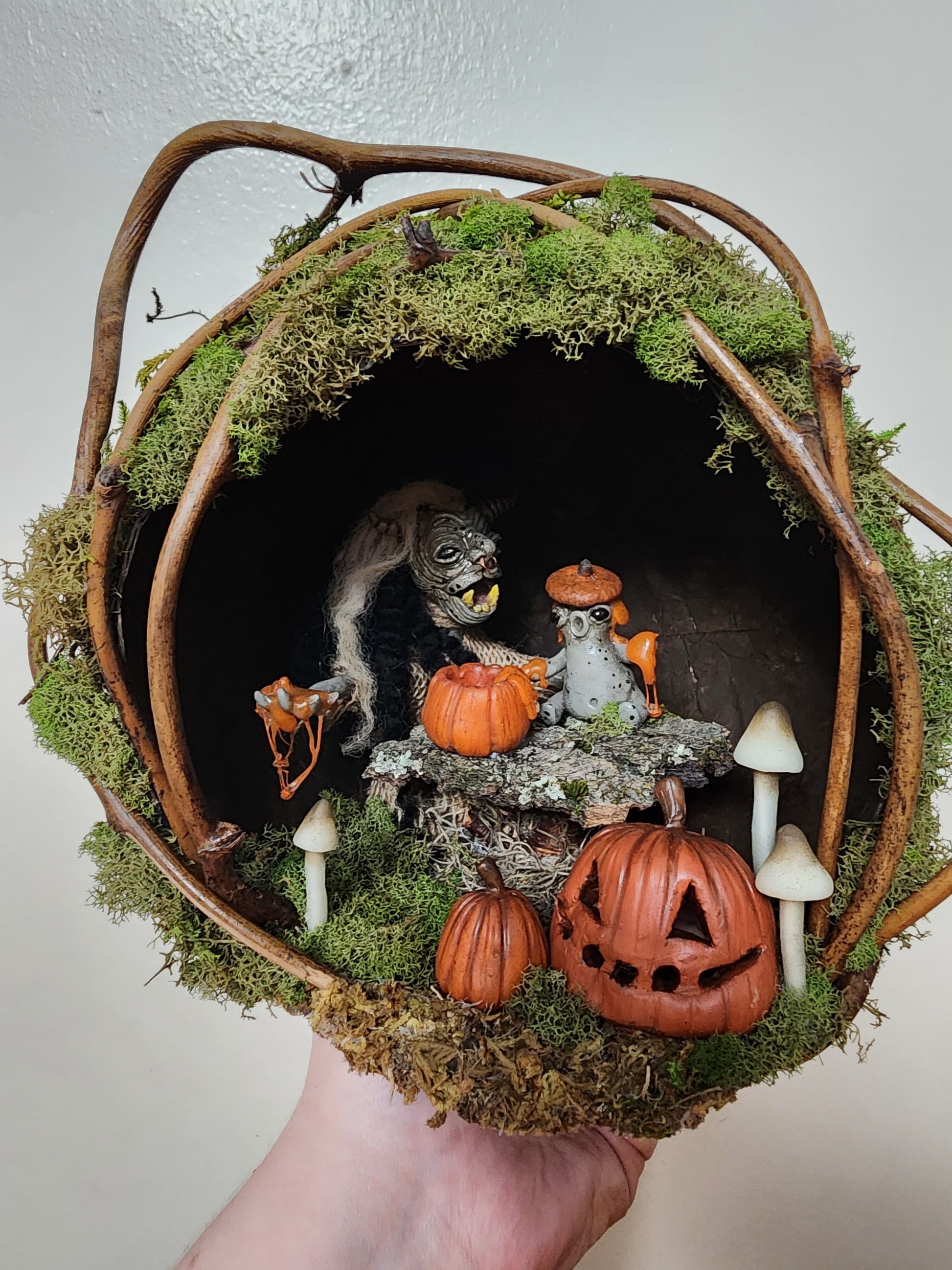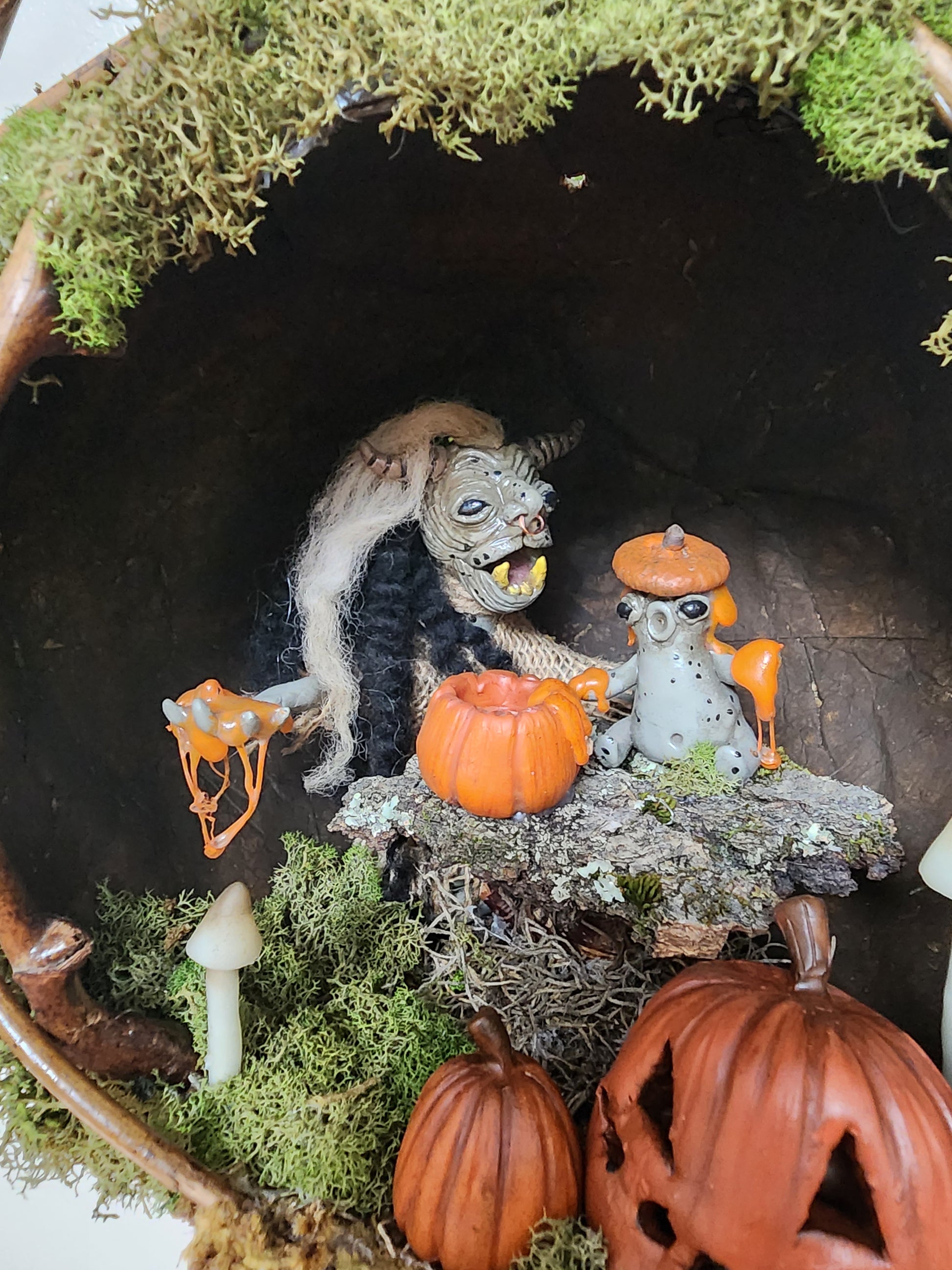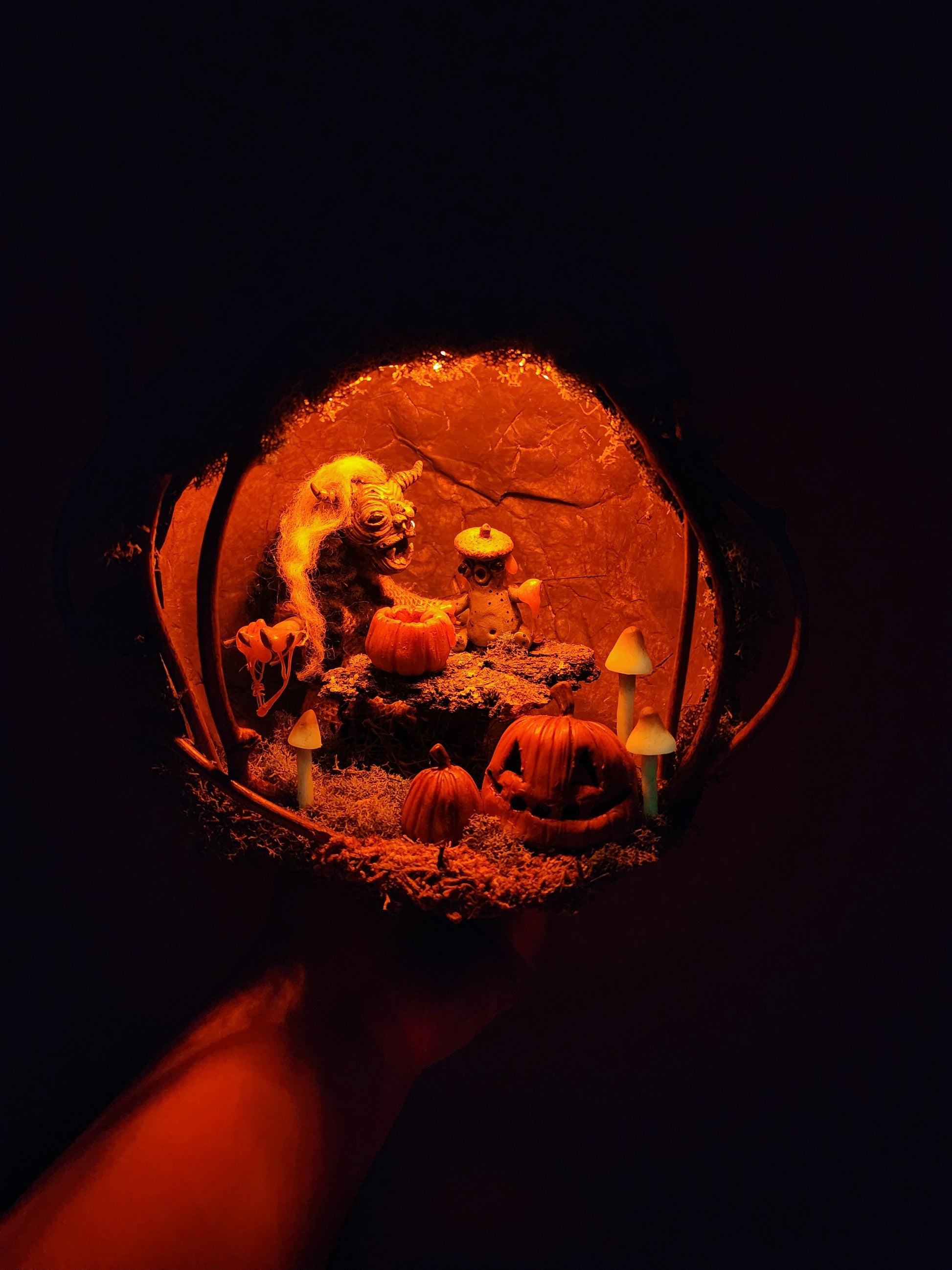 In a quaint corner of Bloodmoon Forest, nestled amidst the towering trees and lush foliage, there sits a captivating troll hole. Inside, a heartwarming scene unfolds as a mommy troll, with her weathered yet gentle features, sits cross-legged beside her wide-eyed baby troll carving pumpkins for the first time. The dim, ethereal glow of firefly lanterns illuminate their faces, casting a warm and magical aura around their makeshift table. This charming terrarium captures the essence of a whimsical spooky forest world, where trolls discover the joy of pumpkin carving and foarging precious memories beneath the canopy of ancient trees.