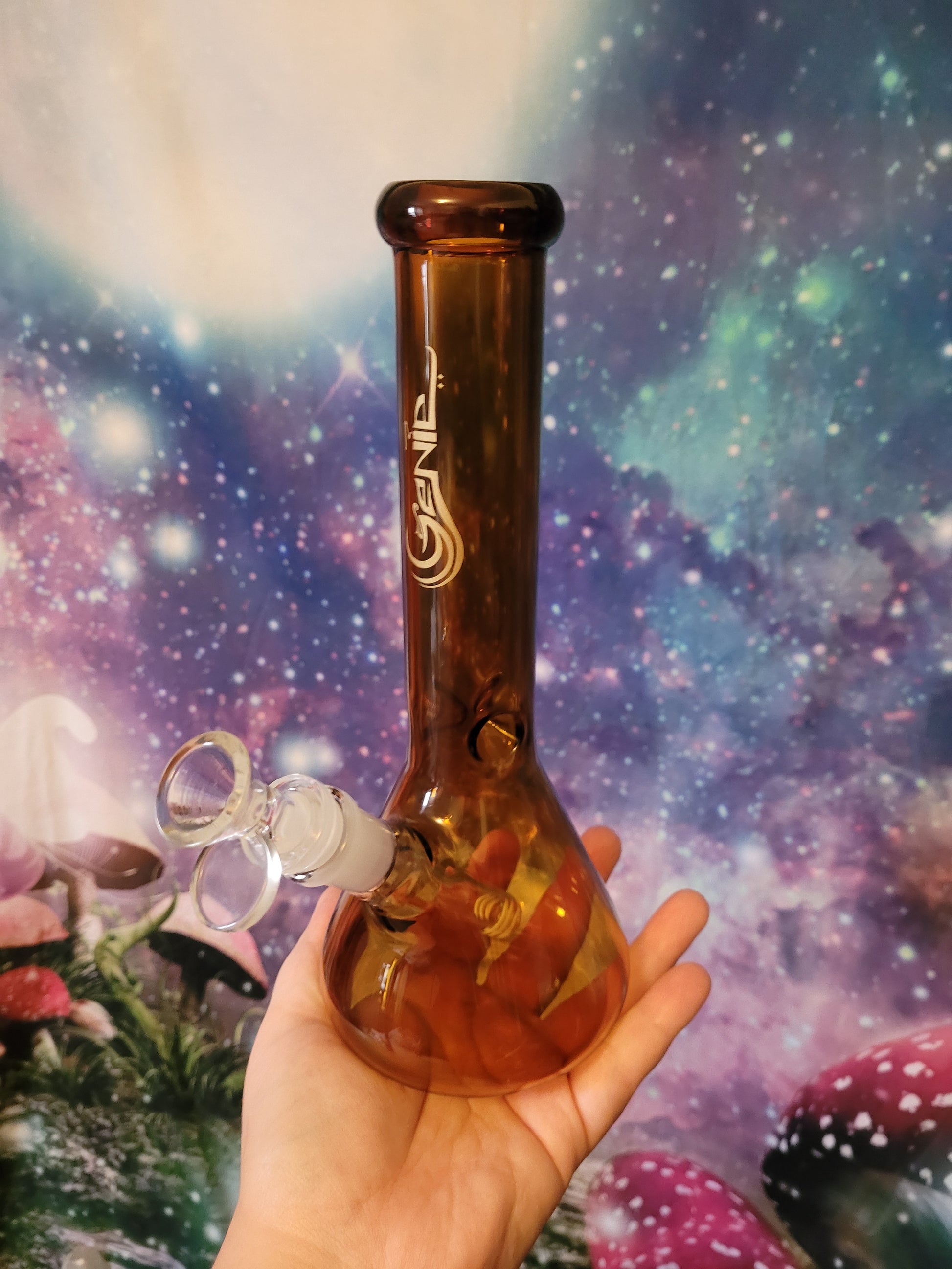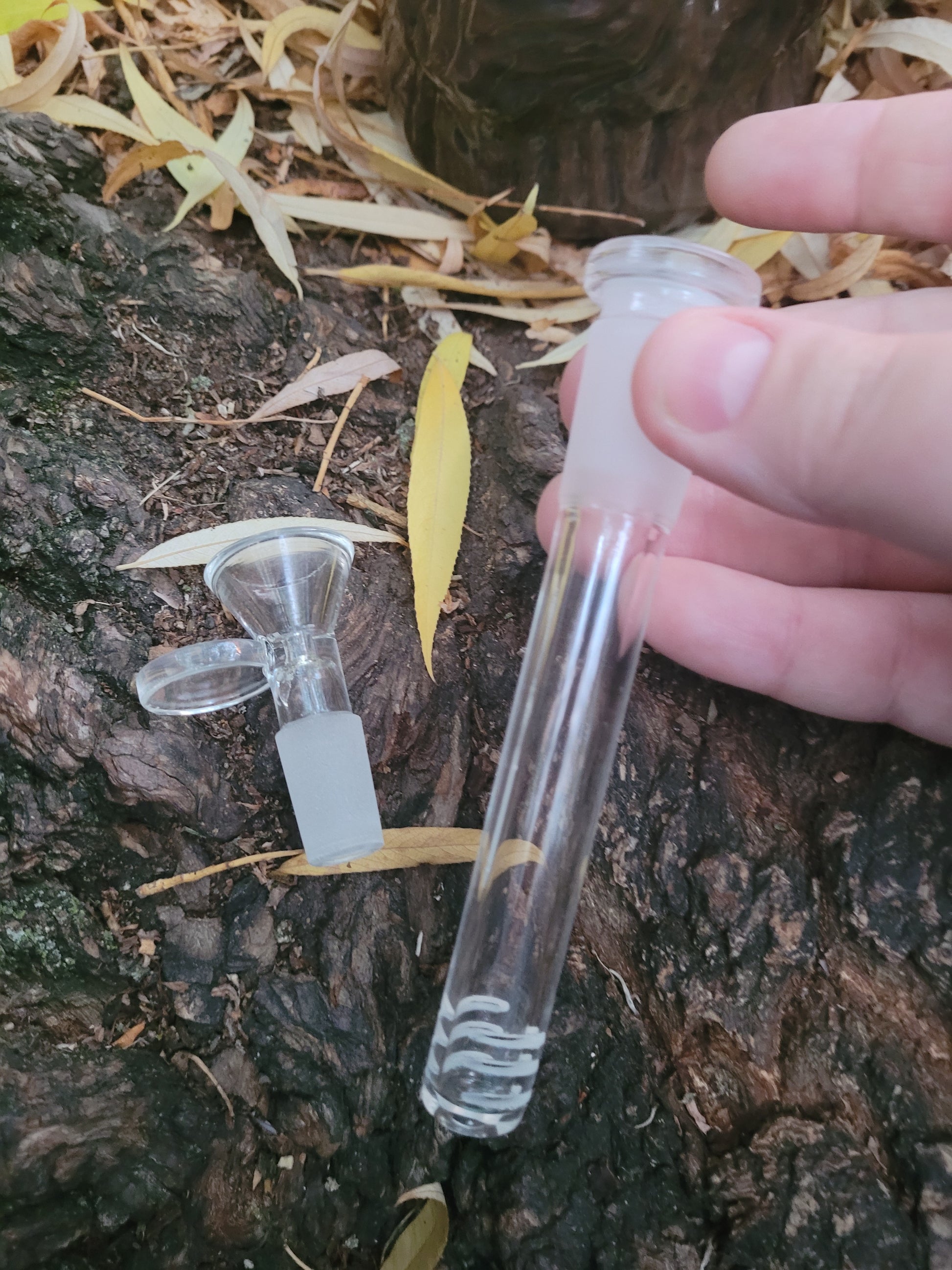I coated this clay covered glass bong with epoxy resin so that it is completely waterproof and it can be properly cleaned. The bong has an ice catcher and is 10 inches. The bowl and downstem are included. It weighs 1.1 kg.