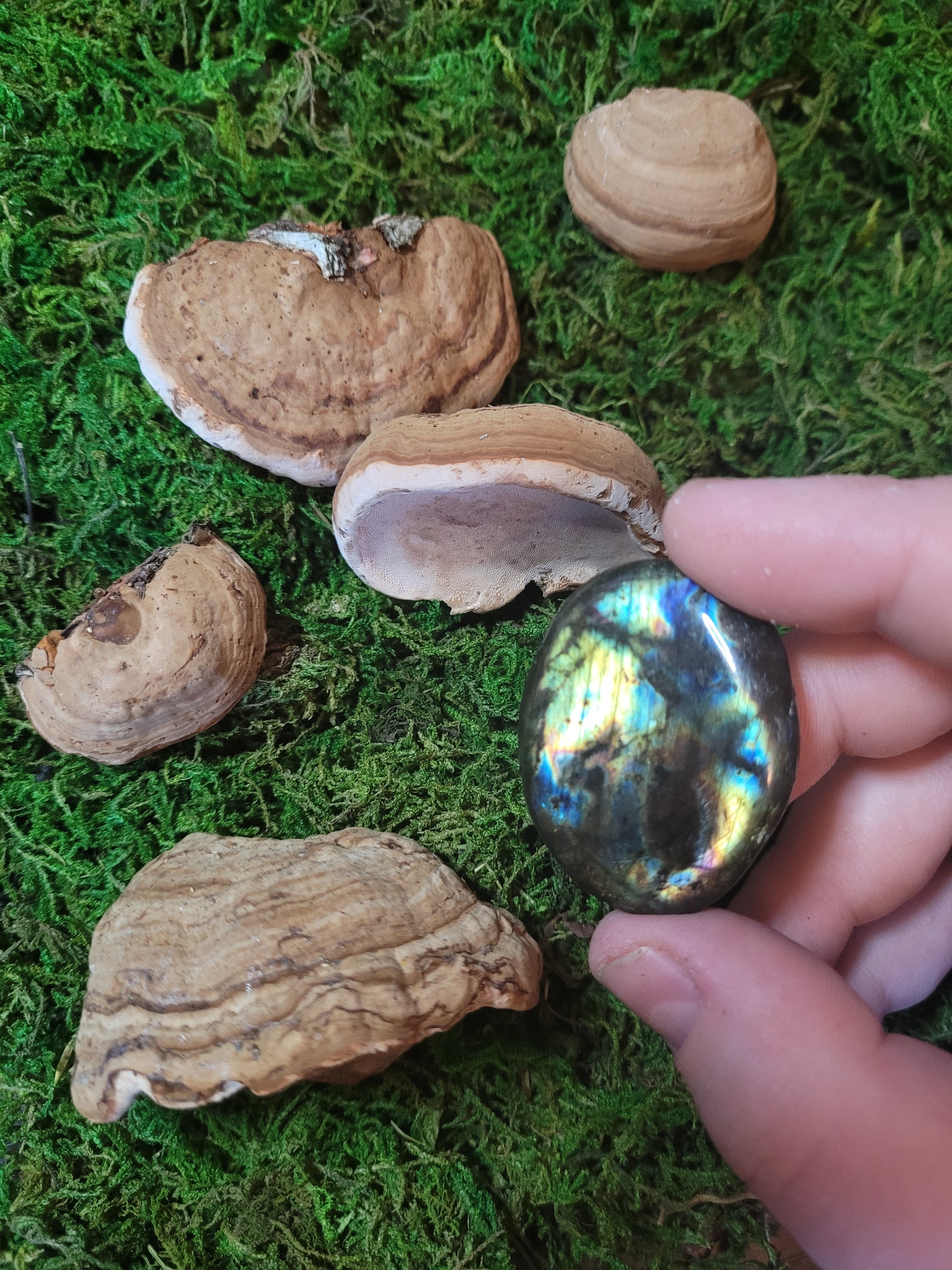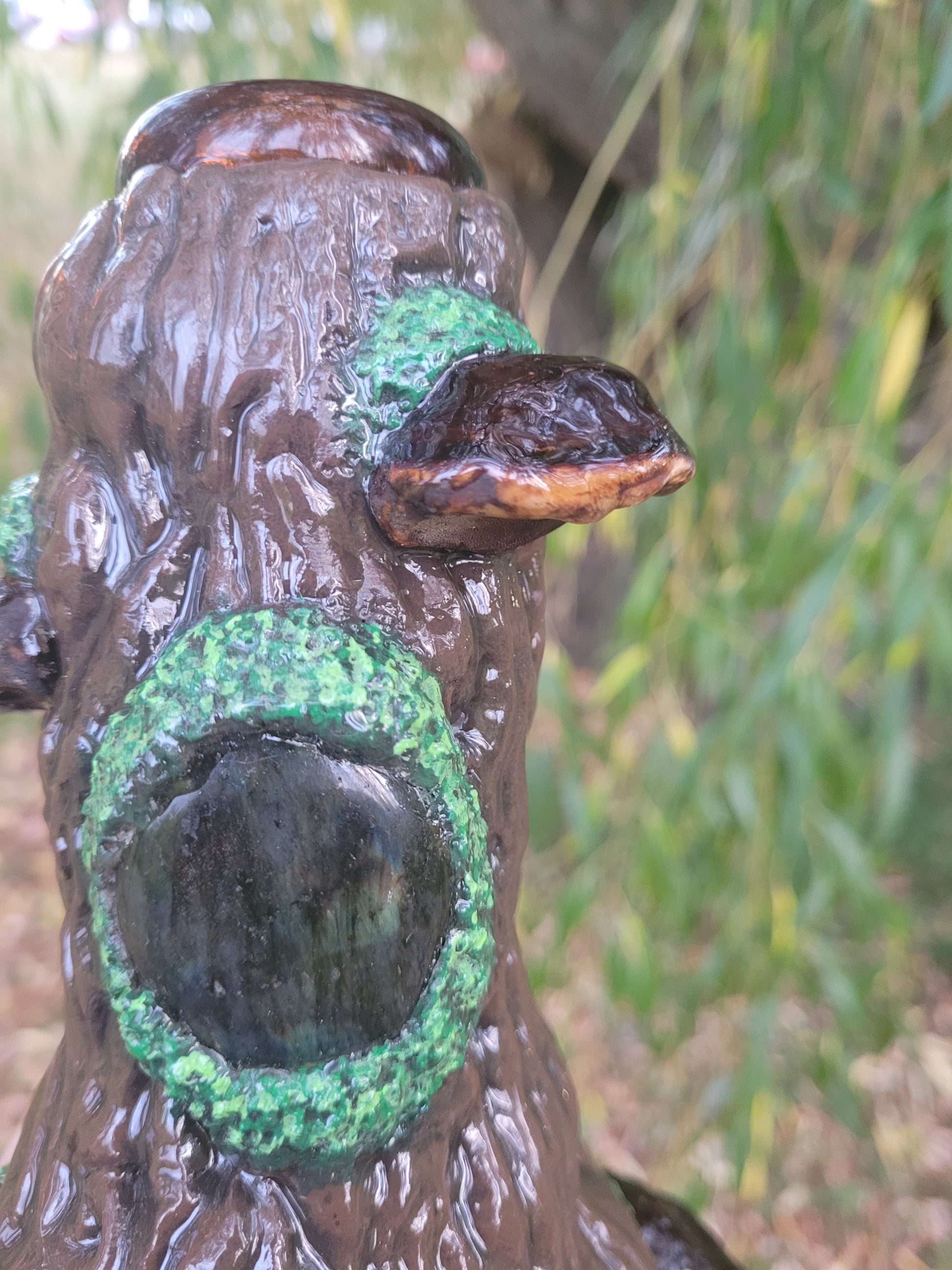 I've been intensely inspired by trees lately so I wanted to create a magical piece that would bring the energy of the deep woods into your sesh. The mushrooms on this bong are real and they were sustainably foraged by myself. A labradorite crystal hugged by moss gives this bong an enchanted twist. Labradorite is a very strong psychic stone and a powerful protector. Even if you're not into crystals the look of labradorite alone enhances this tree dudes magical vibes. While this bong is not being used it serves as an art piece.